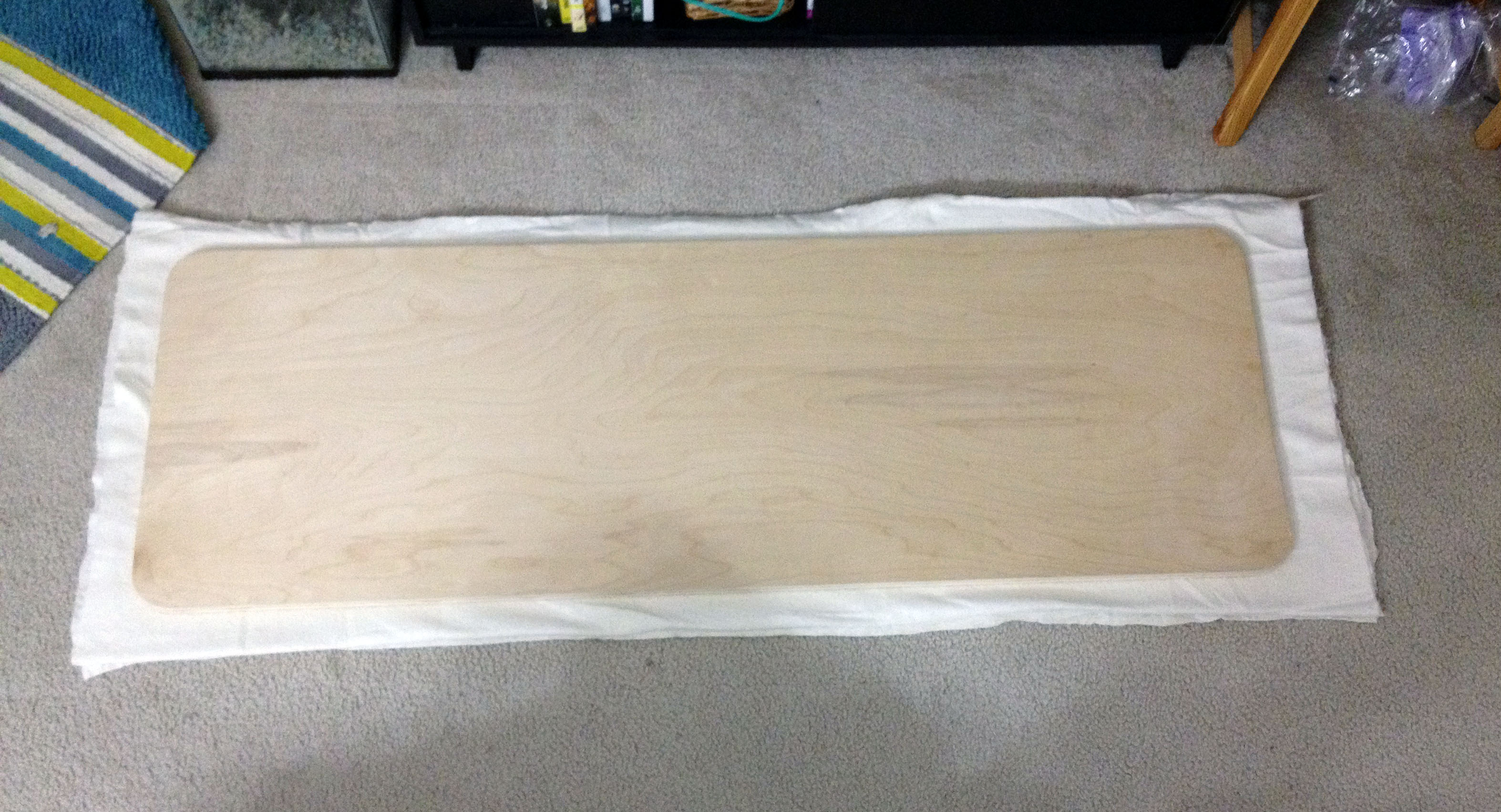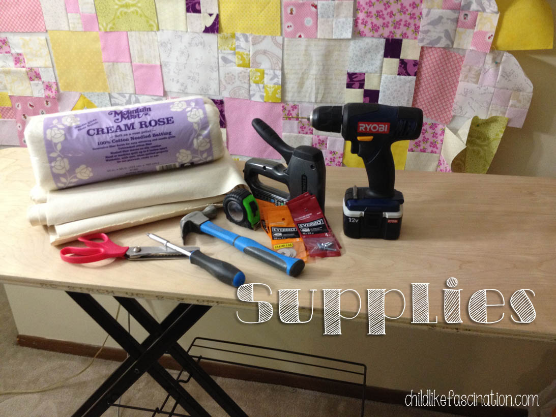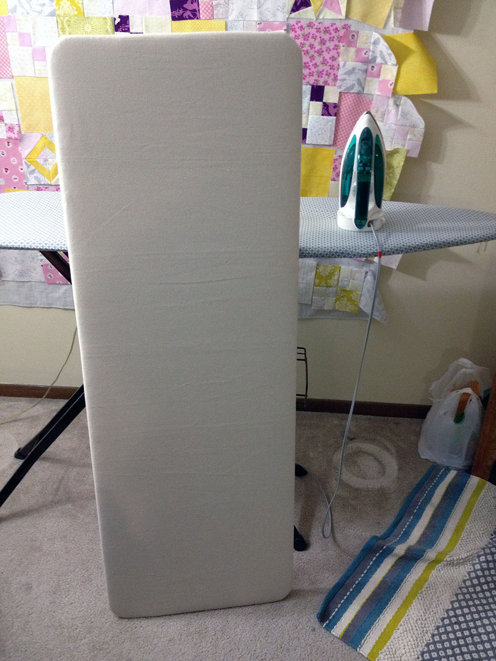 I’d seen videos and tutorials about making your own press boards and decided what I wanted to do was fit a press board on the frame of my ironing board, so yesterday that’s what I did. I had a friend of mine cut me a board, I think it’s birch which is probably a much nicer and heavier wood than I needed to use but it’s what he had on hand and I thought it best to stay away from woods with glue in them because of the heat of the iron. Fortunately even though my living room is my sewing area I live alone so no one is bothered by the fact my ironing board is only put away once a blue moon. I measured my current ironing board and asked him to cut me a piece at a little bigger, at least 55×19″ My goal was to be able to press a whole fat quarter. I picked it up from his garage last weekend then ran to Jo-Ann’s, Home Depot and Burger King to get started. (Burger King is optional but sometimes I’m too busy crafting to cook, don’t judge me.)