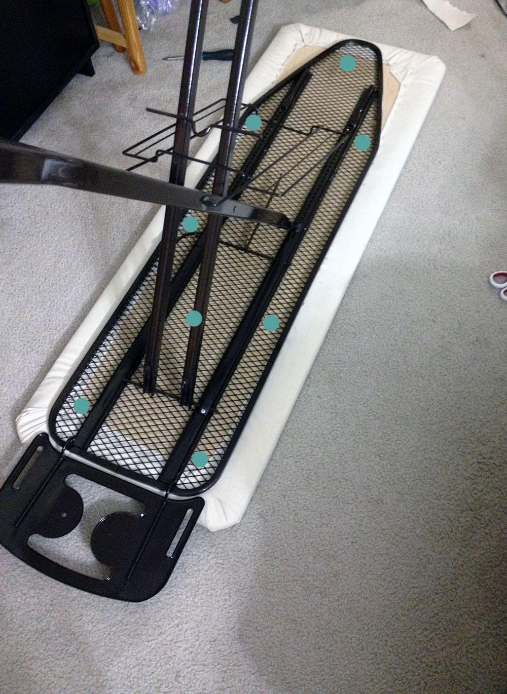 - Center the ironing board base on your board and mark on the board where you want to attach the screws. Try and spread it out pretty evenly and creating triangles (triangles are strong) On this photo I’ve illustrated where all my screw were attached.