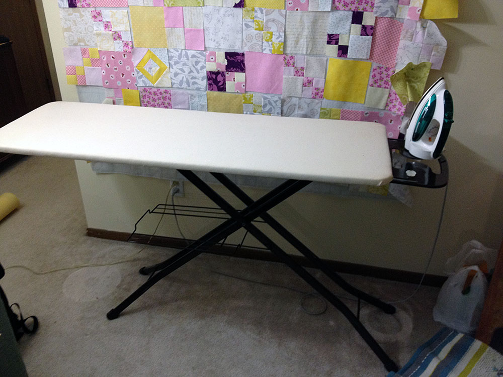 If always drove me nuts that I had to preposition a fat quarter at least twice to fully iron it and that when ironing a full width of a yard of fabric the 44″ didn’t fit on the squared surface of the ironing board.
