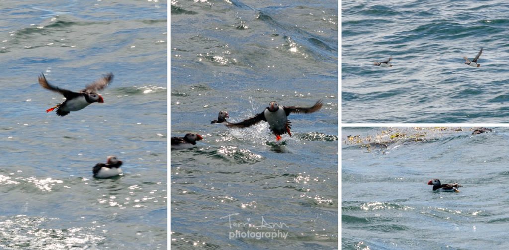 It was surprising how excellent fliers they are! Puffins can fly up to 55 mph (89 kph) and tend to maintain a cruising altitude of 30 feet (9 meters) above sea level. That’s faster than most waterfowl flight speeds, and the puffins’ wings beat so quickly, like an oversized sea hummingbird! I wish I’d bumped up the ISO on my camera.