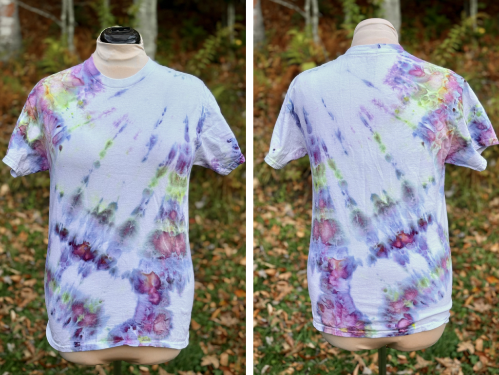 This one’s my least favorite. I used a Gildan tee from Michaels in my usual size, but it turned out more fitted than I expected and not very soft, even after washing. I also wish I’d used more dye to get deeper saturation in the twist, though I’m not really fond of the pattern the twisting created anyway. During rinsing, some stray dye bled into the white areas, softening the contrast, which wasn’t ideal.