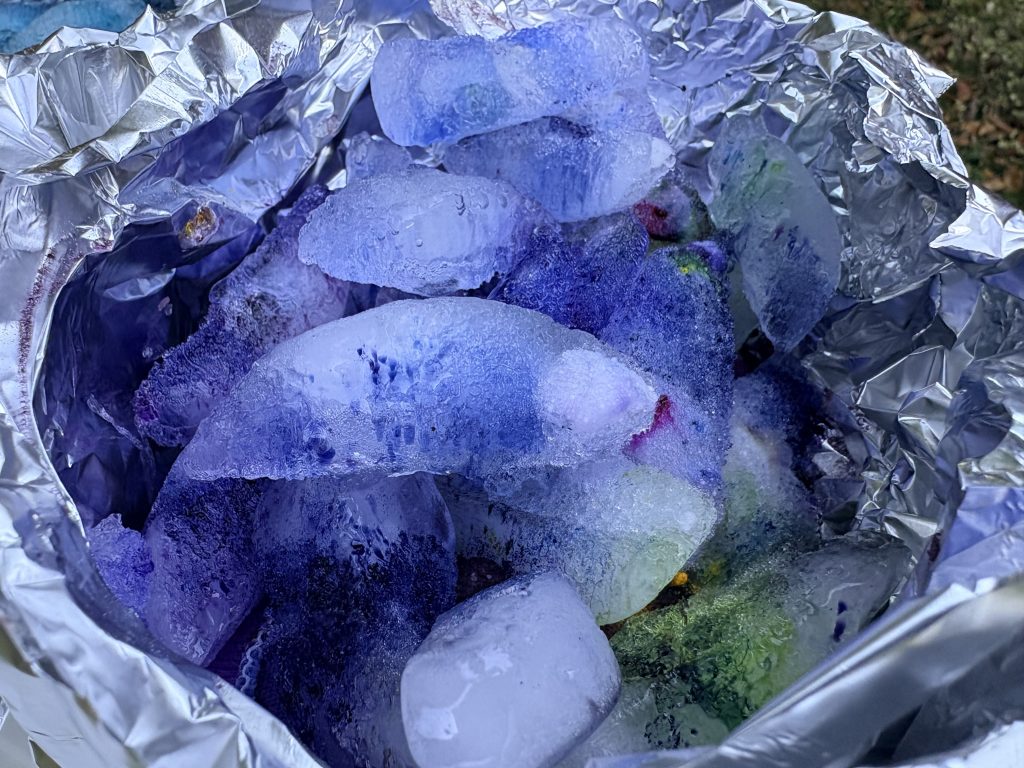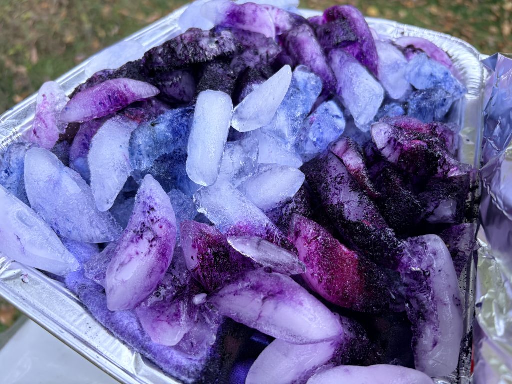 After recently playing around with textile dyeing and making some swatches, I decided to try ice dyeing on actual clothes. Honestly, I’m thrilled with how it turned out, especially since I’m very new at this! I experimented with both the “hills and valleys” and a fabric-coiling technique. I definitely prefer the more random, organic look that came from the hills and valleys approach.