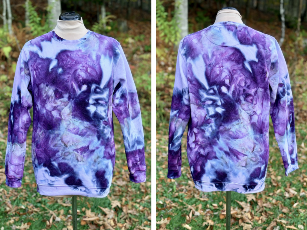 This one’s another favorite…except it’s a size too small. I used a ready-to-dye (RTD) sweatshirt from Dharma Trading and two dyes: Wedgewood Blue (76) and Power Berry (161) Procion Dyes, also from Dharma Trading. I’m going to see what I can do to refashion it since the main issue is that it’s tight around the bottom band.